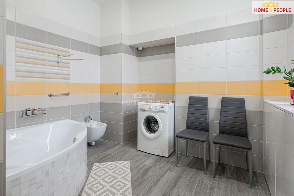 V prvním patře se nachází prostorná bytová jednotka s vlastní terasou a výhledem do zahrady: jídelna s krbem, obývací pokoj, kuchyně, tři ložnice, pracovna a dvě koupelny. V podkroví se nachází další samostatný pokoj.