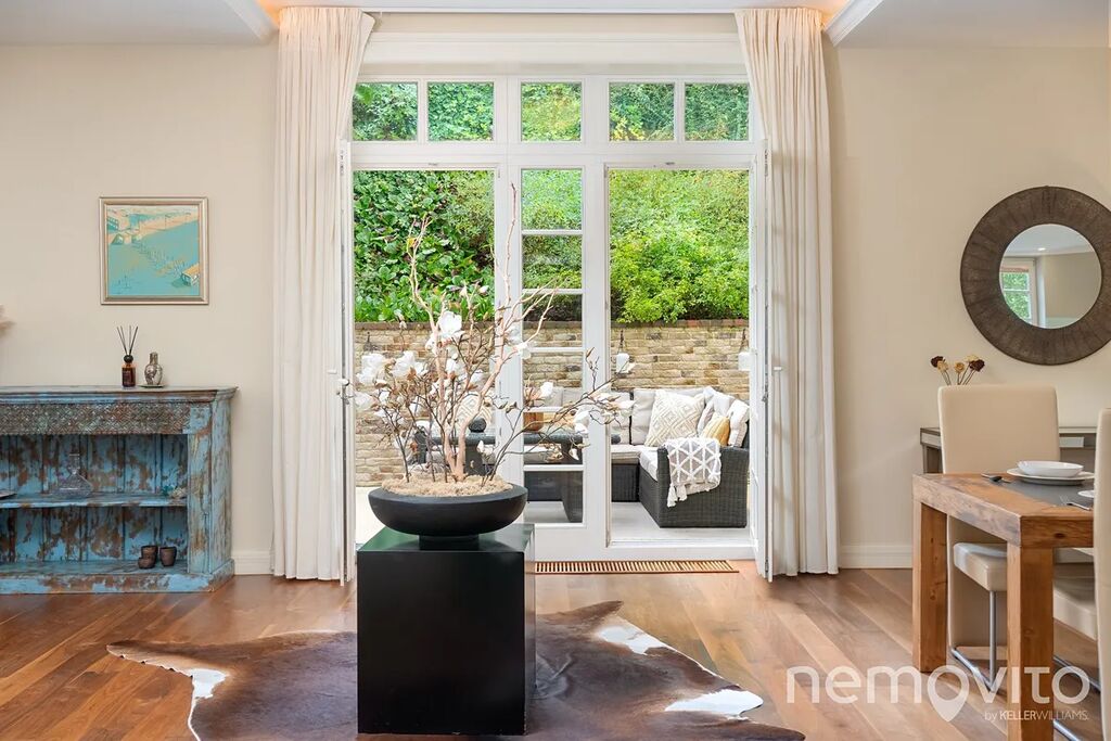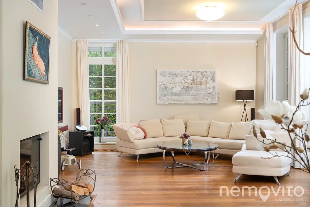 The dominant feature of the house is the living room, whose area is almost 100 sqm in total, with several French windows. These provide amazing views of the green garden, which is designed with maximum privacy. The living room has a fireplace and an entrance to the terrace. Thanks to the terrain difference, it is completely separated from the neighboring street. The space can easily accommodate up to twenty guests.