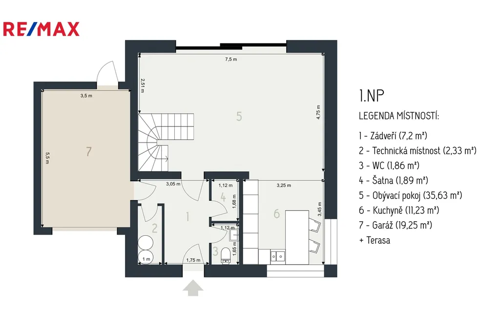 Dispozičně je dům řešen takto: Po vstupu do zádveří je k dispozici WC s umyvadlem pro hosty, šatna a technická místnost, ze které je přístup k vnitřnímu vchodu do garáže, určené pro jeden automobil. Z obývacího pokoje, jehož součástí je jídelní kout, je východ na terasu a prostornou zahradu s ochlazovacím bazénkem o rozměrech 4 m², ideální pro letní osvěžení.