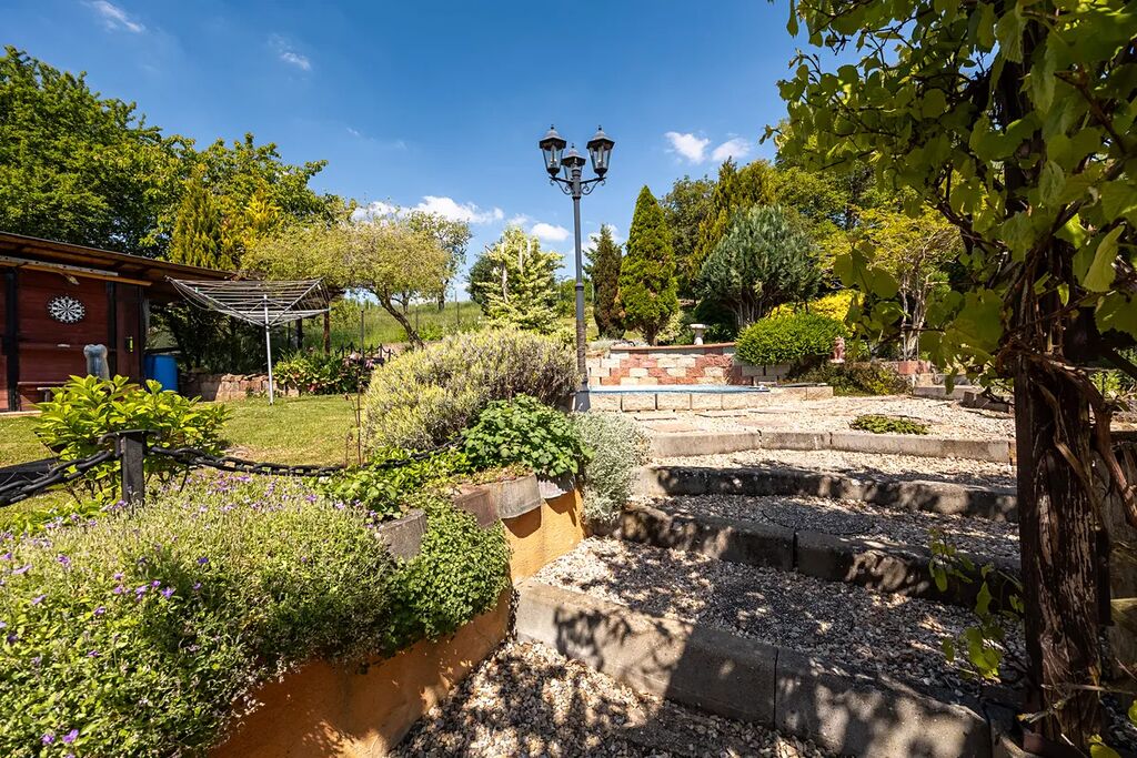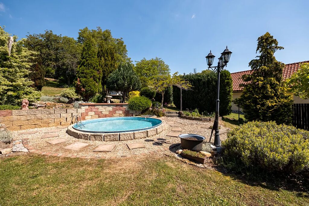 Krásná upravená zahrada v mírném svahu s bazénem a jezírkem.