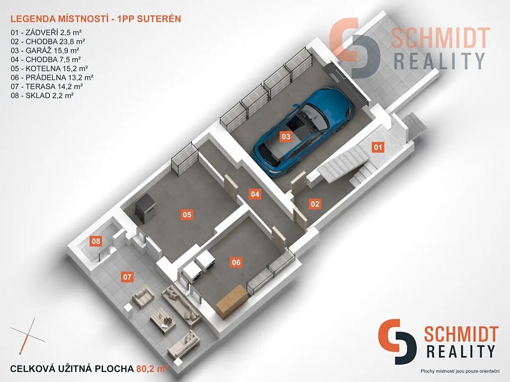 Dům je členěn do tří podlaží. V suterénu se nachází garáž s průchodem na dvůr, prádelna, dílna, technická místnost a chodba. V přízemí najdete zádveří, prostornou kuchyň s jídelnou, toaletu s technickou místností a světlý obývací pokoj se vstupem na terasu orientovanou do zahrady. V horním patře je situována ložnice s přístupem na lodžii, prostorný pokoj, koupelna s vanou, sprchovým koutem a samostatná toaleta
