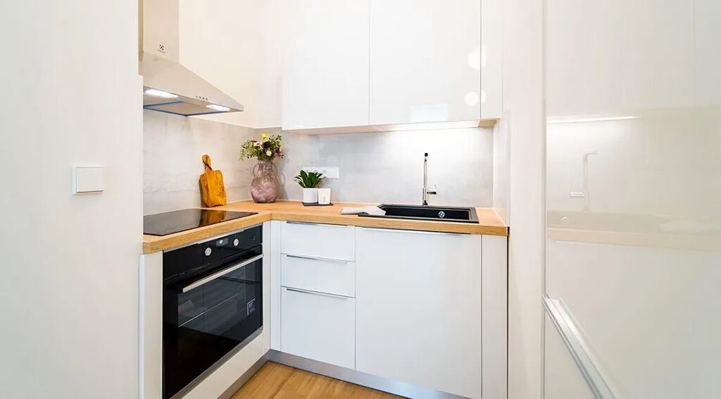 Dispozice prostoru nabízí vstupní chodbu (2,7m2), prostornou místnost (25,4m2) s kuchyňským zázemím zařízeným vestavěnými spotřebiči (lednice, mrazák, varná deska, myčka), předsíň se vstupem do další samostatné místnosti (12,2m2), stylovou koupelnu (3,6m2) se sprchovým koutem, umyvadlem a toaletou.