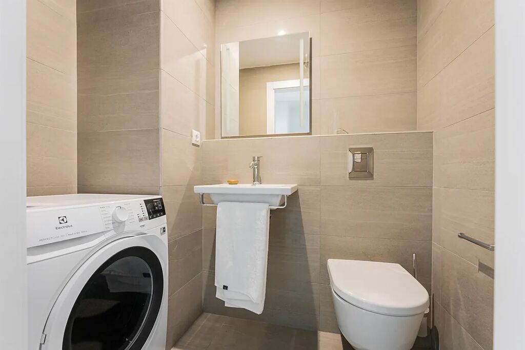 Interiér tohoto bytu je plně zařízený a dispozičně nabízí vstupní chodbu (3m2) s oddělenou toaletou, prostorný obývací pokoj (30,11m2) s plně vybaveným kuchyňským koutem (lednice, mrazák, trouba, myčka, elektrická varná deska, mikrovlnná trouba, digestoř), samostatnou ložnici (17,14m2), a stylovou koupelnu (7,74m2) s vanou, sprchovým koutem, umyvadlem, toaletou a bidetem. Výhodou bytu je dostupnost terasy z obou místností. K dispozici je sklep.