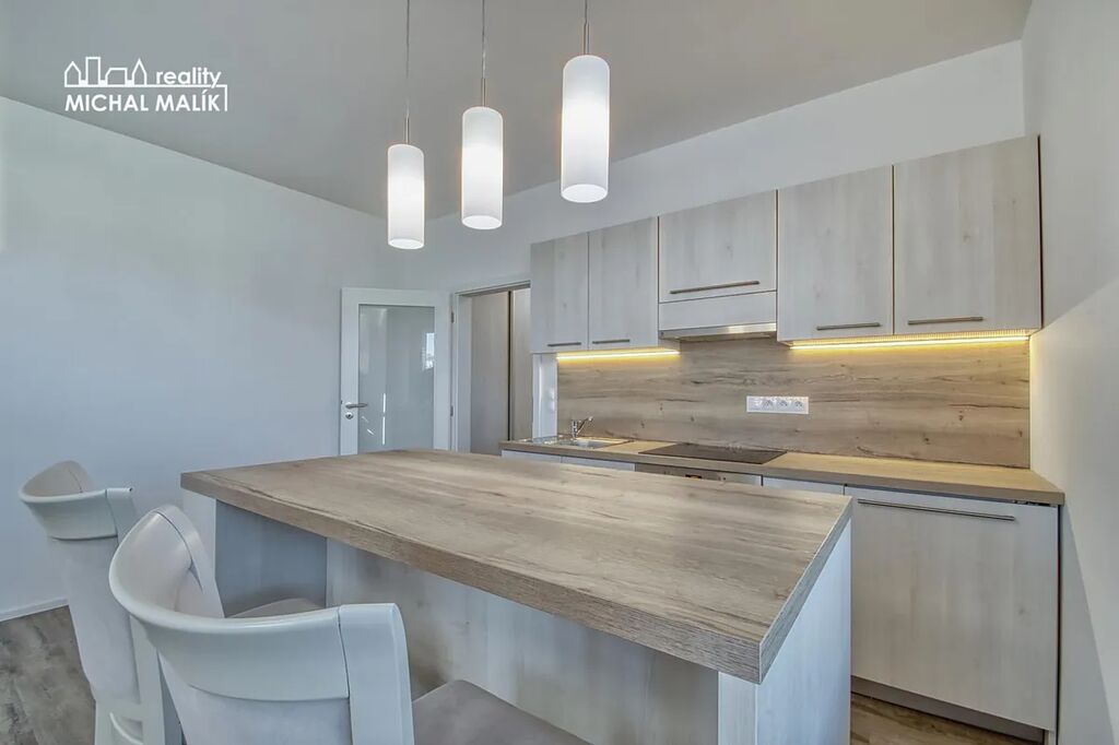 Hlavní obytný prostor zahrnuje plnohodnotnou kuchyňskou linku na míru, včetně elektrické varné desky, horkovzdušné trouby, digestoře a malé vestavěné lednice. Kuchyňský kout plynule navazuje na obývací část s jídelním pultem, který může sloužit jako jídelní stůl. Z obývacího prostoru je vstup na prostornou terasu o rozloze téměř 7 m s výhledem do zeleně a na malebný hranický kostelíček.