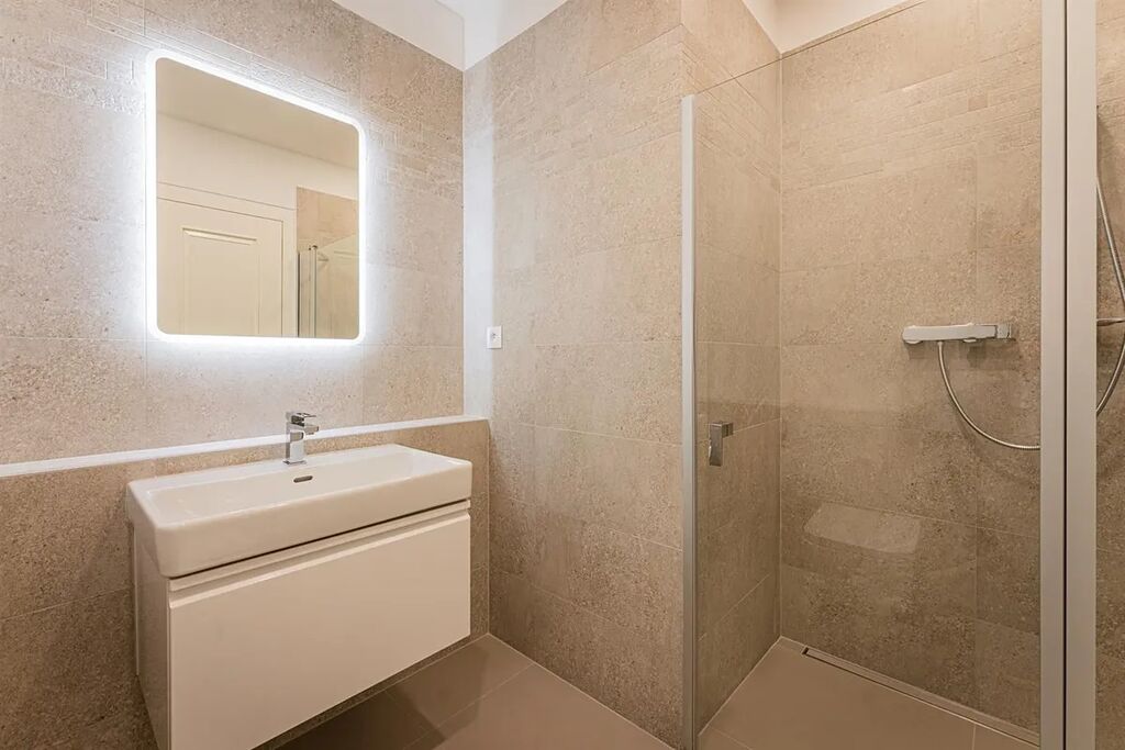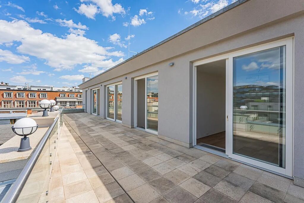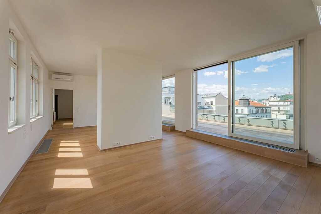 Prostorný byt 3+1 s prostornou terasou 57 m2, která nabízí hezké výhledy a podlahovou plochou 117 m2. Byt je situovaný v posledním 6. patře kompletně zrekonstruovaného domu se zachovalými původními art deco prvky. Výtah přímo do bytu. Dispozice bytu nabízí obývací pokoj, oddělený jídelní prostor, plně vybavenou kuchyň, dvě ložnice, dvě koupelny (jedna s vanou, druhá se sprchovým koutem), komoru, oddělenou toaletu a vstupní halu. Kuchyň je vybavena vestavěnými spotřebiči myčka, mikrovlnka, trouba, indukční varná deska, lednice a mrazák. Kvalitní materiály a provedení, vysoké stropy, podlahy z běleného dubu, dlažba, vytápěné podlahy v koupelnách, alarm, videotelefon, vstup do budovy na čip. Vstup na terasu je možný z obývacího pokoje, kuchyně a všech ložnic. Byt je možno zařídit nábytkem za vyšší nájemné. Výborná dopravní dostupnost pár kroků od stanic metra Národní třída (trasa B) a Můstek (trasy A, B) a zastávek tramvají Vodičkova a Národní třída. Výhodou je také široké spektrum služeb dostupných v blízkém okolí a v nedalekém obchodním centru Quadrio. Poplatky za společné služby a zálohy jsou ve výši 5000,/měsíc na dvě osoby. Spotřeba energií se převádí na nájemce.