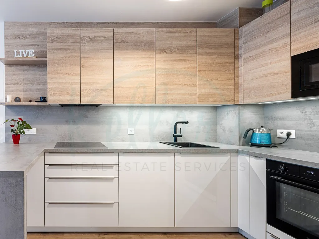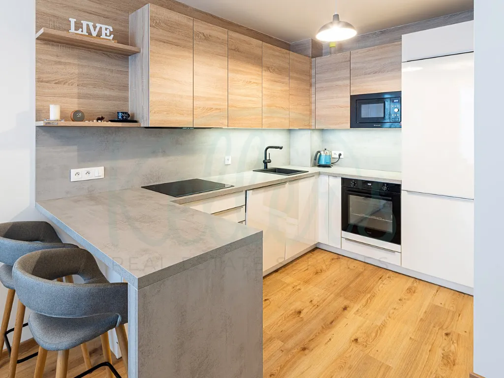 Součástí vybavení je moderní kuchyňská linka s barovým pultem, vestavěná mikrovlnná a pečicí trouba, digestoř s uhlíkovými filtry, myčka nádobí, indukční varná deska a lednice s mrazákem značky LIEBHERR. Koupelna je vybavena vanou, toaleta je oddělená. K bytu dále náleží komora na patře o velikosti 2,14 m² a další úložná komora je přímo v bytě.