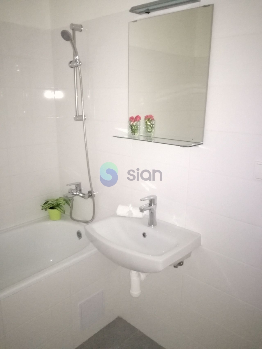 - Prostorná koupelna s vanou, umyvadlem a připojením na pračku