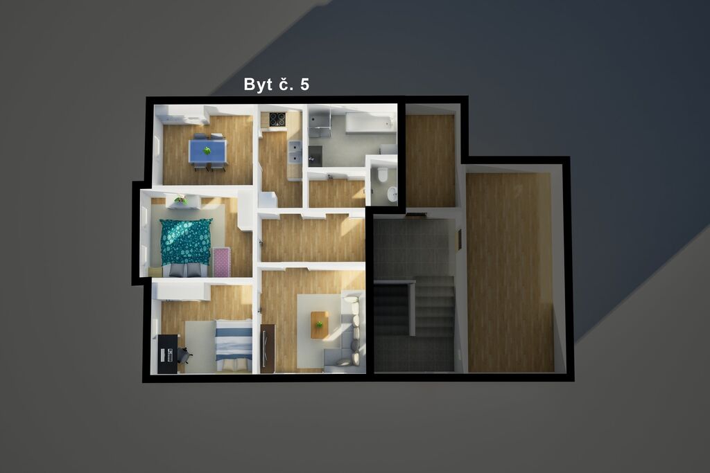 • Byt 2 (43 m²): dva pokoje, samostatná kuchyň a koupelna.