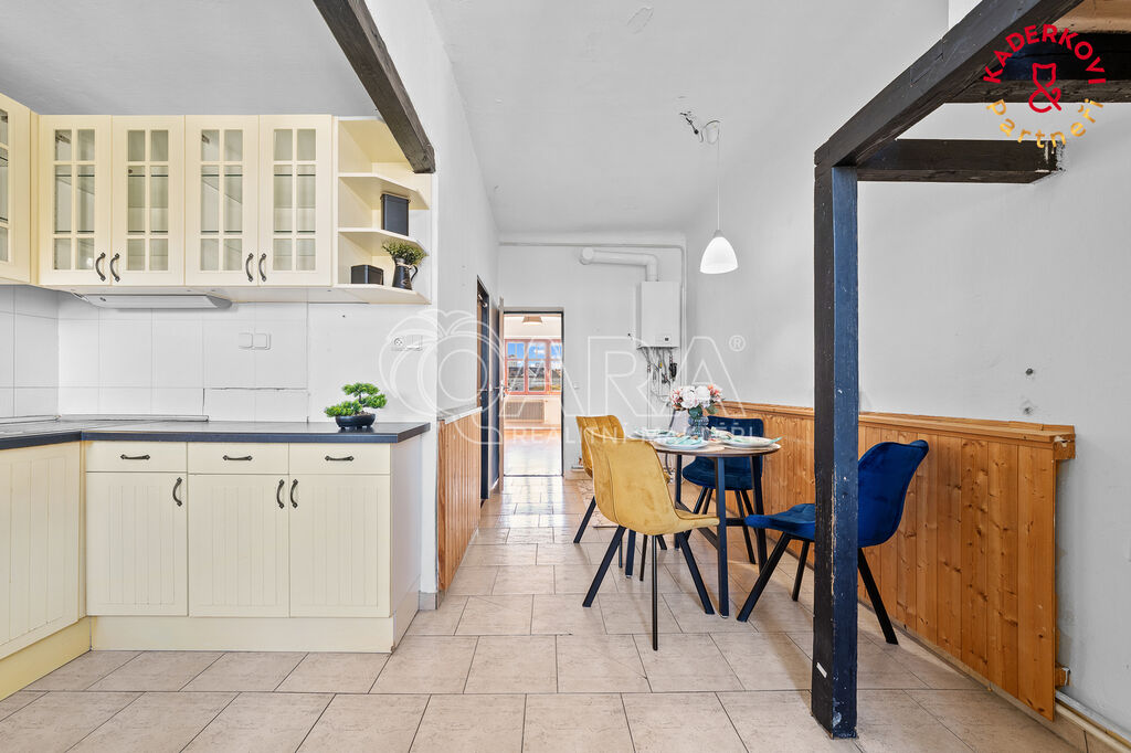 • Jídelna s kuchyní (15,16 m²) – orientovaná na západ směrem do vnitrobloku a zahrady