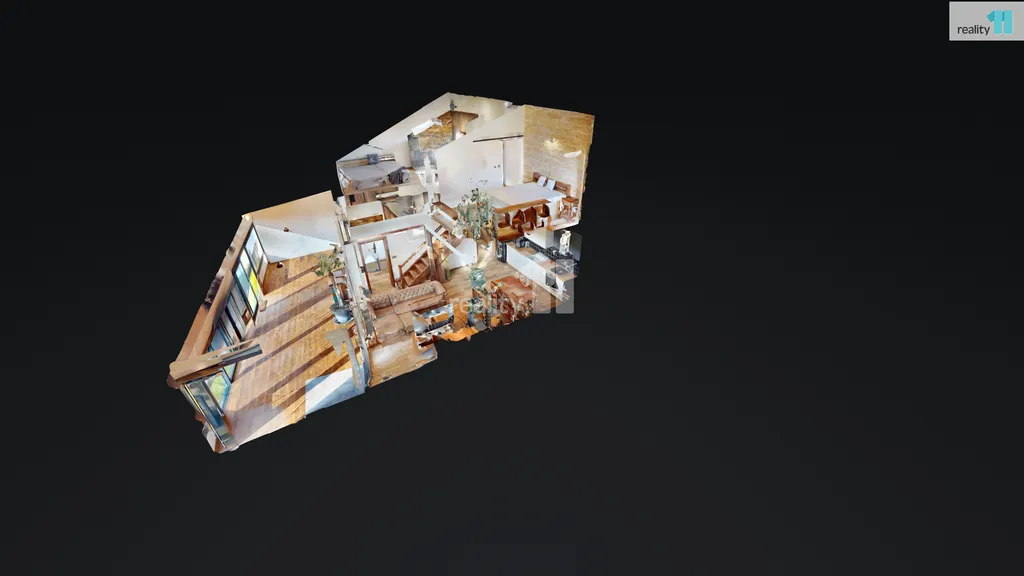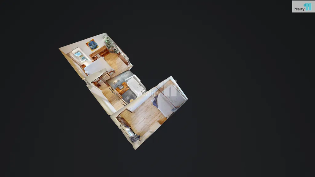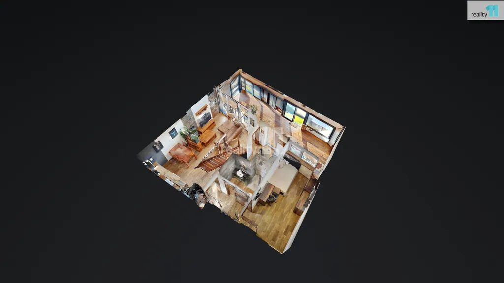 Má skvělou dispozici - z podlouhlé velké zimní zahrady, která je využívána jako pracovna a druhý obývací pokoj, se vchází do zádveří s velkou vestavnou skříní na boty a kabáty. Odtud pak do obývacího pokoje s kuchyňským koutem (velká kuchyňská linka, prostor pro jídelní stůl i rohovou pohovku), který je útulným centrem pro setkání s rodinou a přáteli. Z obývacího pokoje se pak vchází do menší chodby, s výklenkem na technické zázemí (kotel, pračka, sušička a mnoho polic), vstupem do koupelny se sprchovým koutem a toaletou a do ložnice (studentského pokoje) s dalšími skříněmi.