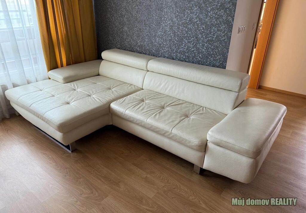 Prostorný obývací pokoj s koženým gaučem a jídelnou