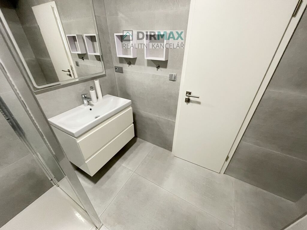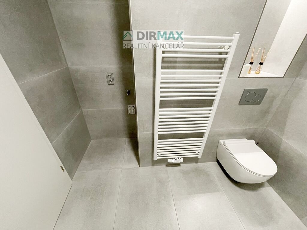 Jádro bytu je zděné, kde v koupelně je příprava na pračku a sušičku, závěsné WC, topný žebřík, prostorný, skleněný sprchový kout, umyvadlo se spodními skříňkami a zrcadlo s osvětlením.