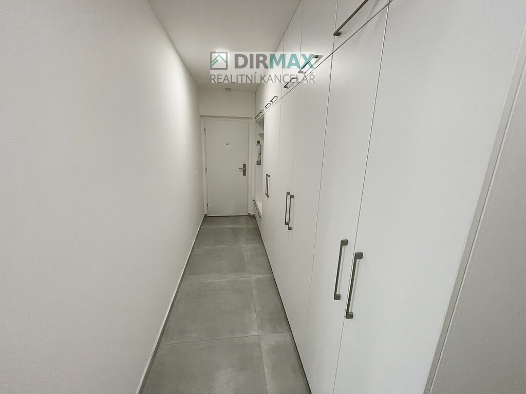 Při vstupu do bytu je velká předsíně s úložnými prostory i s horními nástavci. Pak je tady další vestavěná skříň. Do všech místností bytu se vstupuje samostatně. V kuchyni je projektově řešená kuchyňská linka se značkovými spotřebiči značky Elektrolux. Z vybavení a zařízení je tady indukční varná deska, elektrická trouba, mikrovlnná trouba, myčka, digestoř a lednička s mrazákem. Navazující obývací prostor a jídelní část je skutečně velkých rozměrů. Za kuchyní je pak poměrně velká místnost, fungující jako např. komora. Pak je tady ještě menší špajska s regály např. na potraviny.