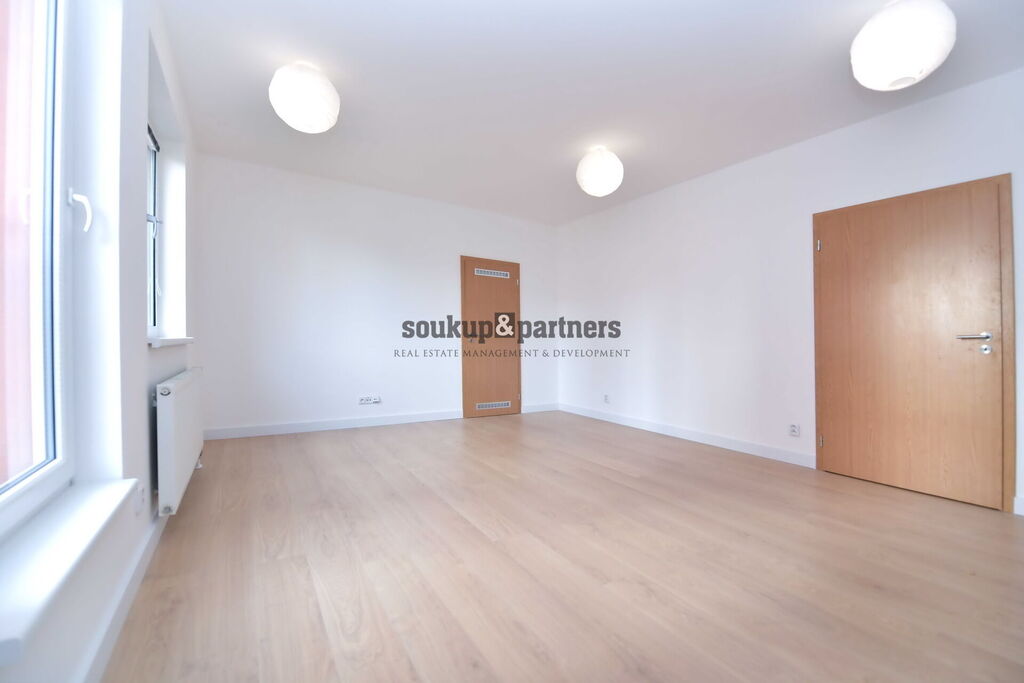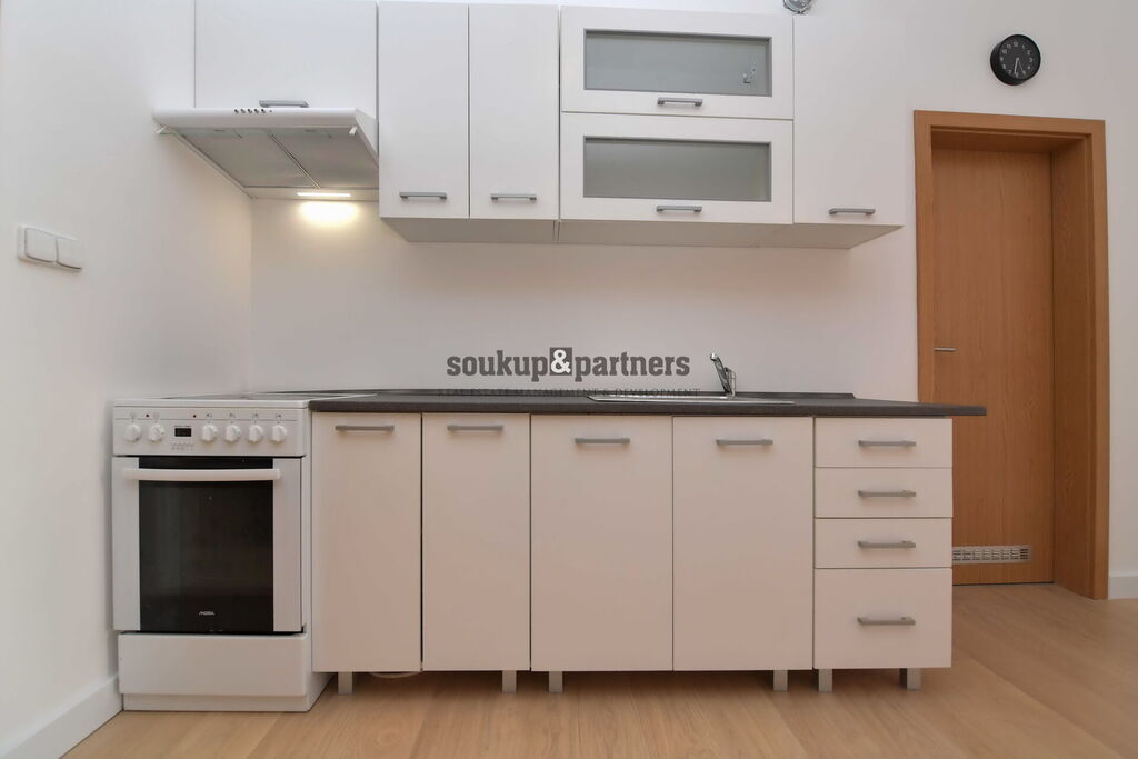 Byt tvoří obytná místnost s moderní kuchyňskou linkou vybavenou indukční varnou deskou, troubou, digestoří a lednicí s mrazákem.