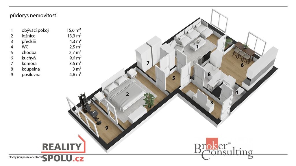 Dispozici tvoří chodba, samostatné WC, koupelna s vanou a podlahovým vytápěním, prostorná šatna, ložnice, obývací pokoj, kuchyně a zasklený balkon s otevíratelnými panely. Sklep není k dispozici, k bytu je však možnost umístit 1 kolo do společné kolárny. Topení i teplá voda jsou centrální. V kuchyni je kompletní kuchyňská linka včetně spotřebičů: varná deska, trouba, mikrovlnná trouba, myčka a lednice (samostatná). Součástí vybavení je také pračka. V ložnici se nachází rám manželské postele včetně roštů a dvě komody, v obývacím pokoji obýváková stěna. Podlahy: parkety (ložnice, obývací pokoj), vinyl (chodba, kuchyně), dlažba (koupelna, WC).
