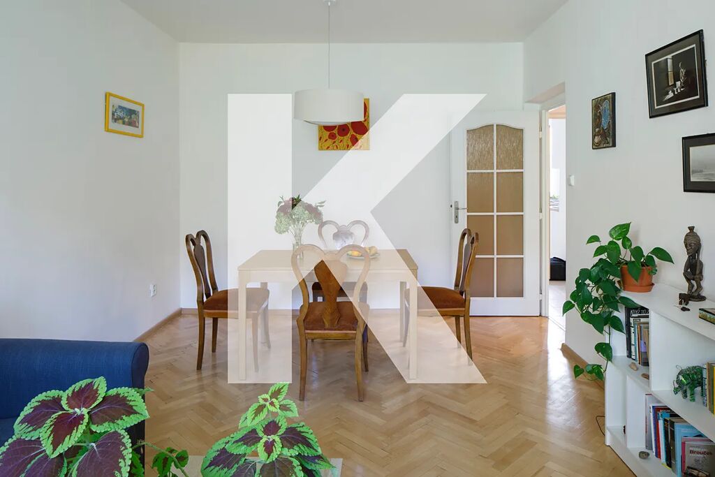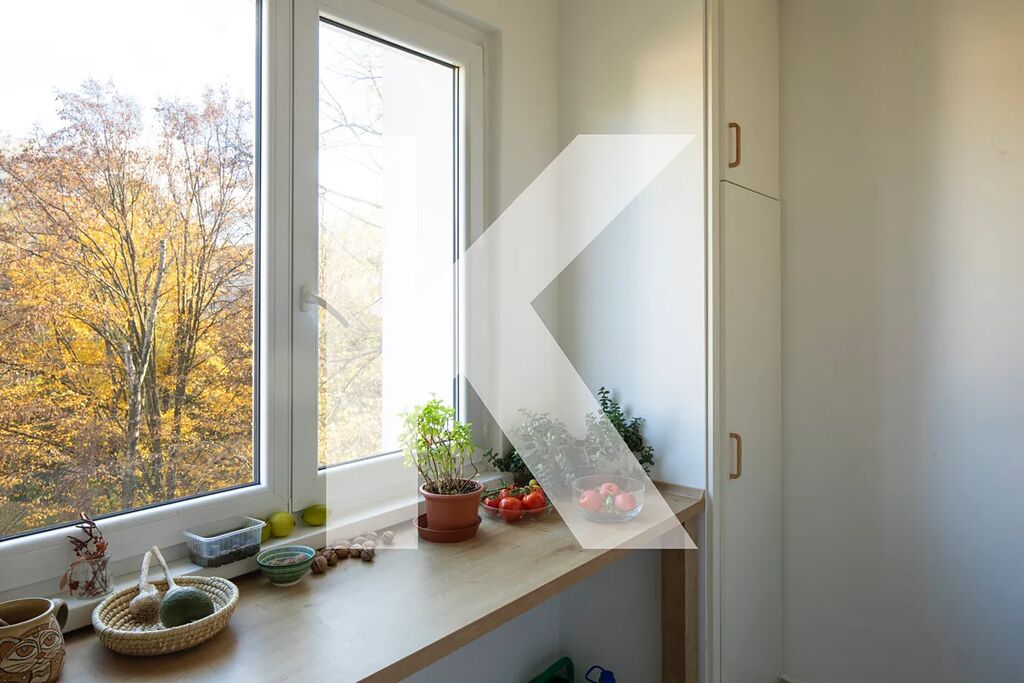 Obývací pokoj je orientován na západ, zatímco ložnice a kuchyň směřují na východ s příjemným výhledem do zeleně. Podlahy tvoří kombinace dřevěných parket a dlažby. K bytu náleží sklepní kóje v suterénu a možnost využívat společné prostory (prádelna, kočárkárna).