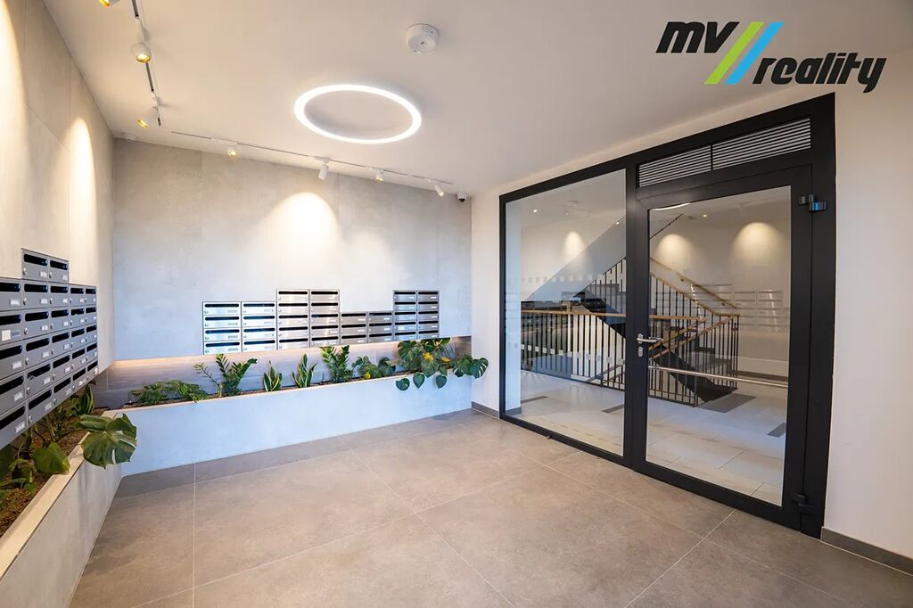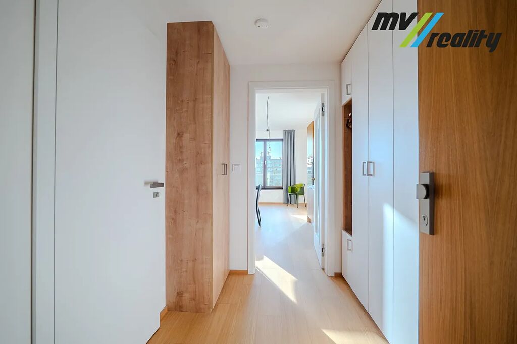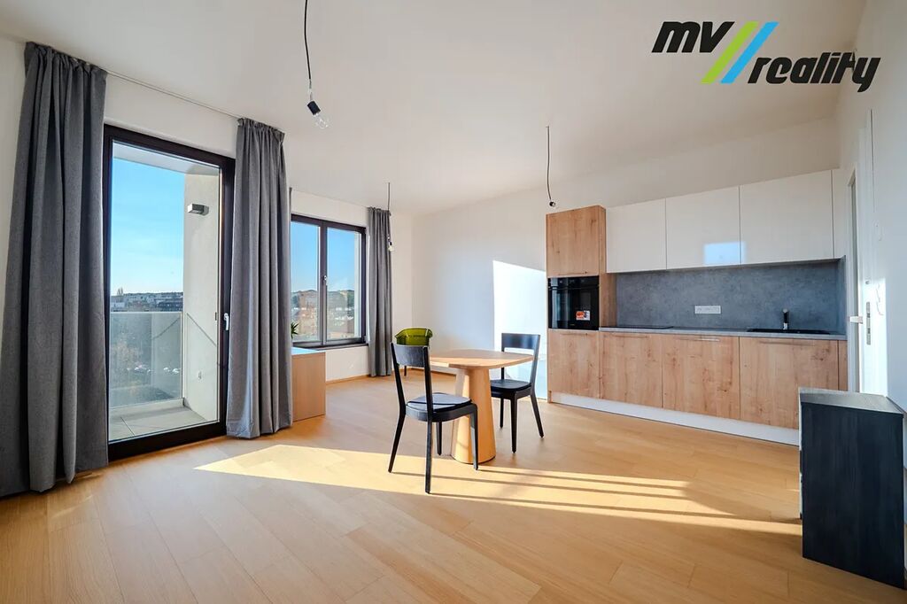 Byt je vybaven moderní kuchyňskou linkou včetně vestavěných spotřebičů, což umožňuje okamžité pohodlné bydlení bez nutnosti dalších investic. Praktická dispozice nabízí dostatek prostoru pro obývací i spací zónu a velká okna zajišťují dostatek denního světla.