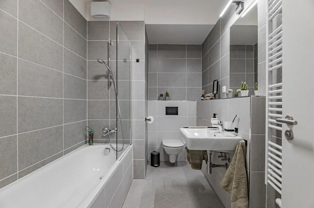 Byt je s kompletně vybavenou koupelnou ve standardním provedení, interiérovými dveřmi, přípravou na kuchyňskou linku a protipožárními vstupními dveřmi.