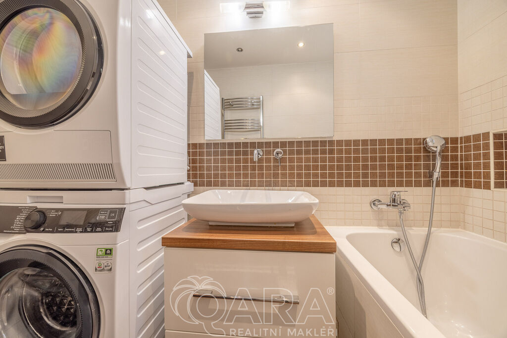 Koupelna má podlahové vytápění, je zde vana, pračka a sušička.