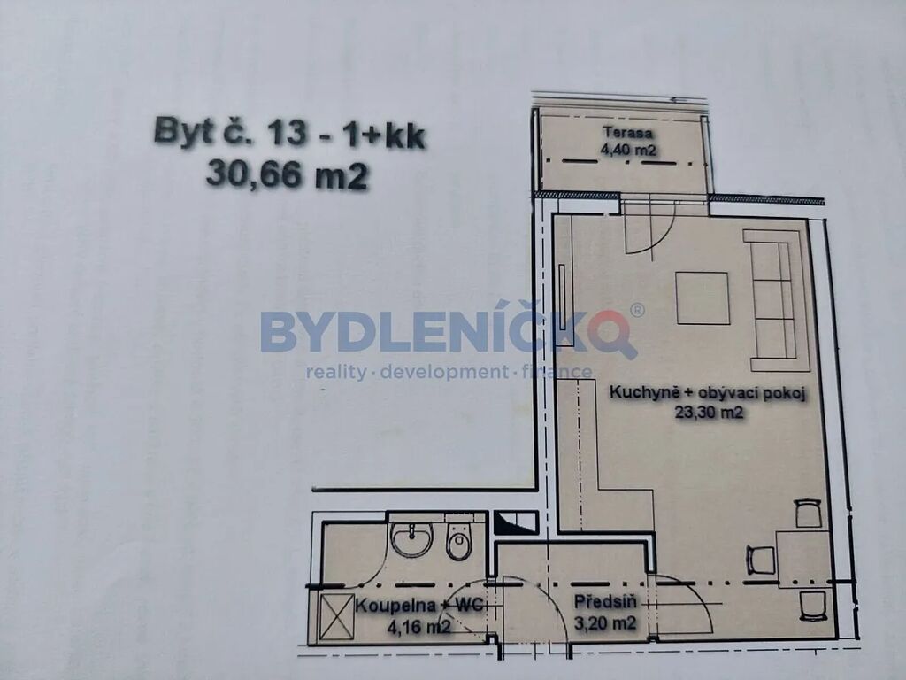 Byt k pronájmu se nachází ve druhém patře zděného domu. Tvoří ho prostorná místnost s kuchyňským koutem, kde najdeme dvouplotýnkový sporák, elektrickou troubu a mikrovlnnou troubu. Oddělený prostor slouží jako obývák a ložnice. V bytě je koupelna se sprchovým koutem, umyvadlem a WC. K bytu patří terasa, sklep na patře a parkovací stání. Hned za domem je obchod s potravinami Flop. Autobusová zastávka je kousek od domu.