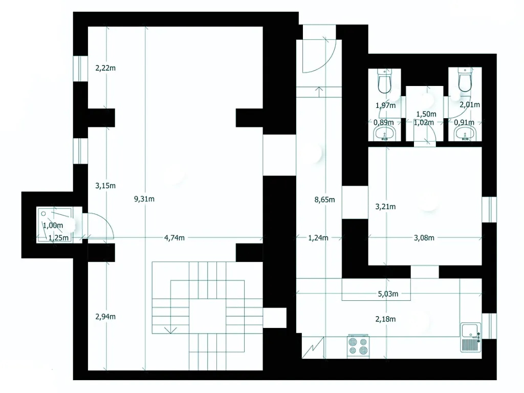 Velkou výhodou je vlastní vstup přímo z ulice, který zvyšuje samostatnost a atraktivitu prostoru. Tento vstup je sdílen pouze se sousední jednotkou, přičemž k předsíni náleží spoluvlastnický podíl. Po vstupu vás přivítá velký a stylový hlavní prostor, dále chodba vedoucí k místnosti s kuchyňskou linkou a další oddělená místnost umožňující variabilní využití. Součástí je sprchový kout a dvě toalety – pánská/dámská.