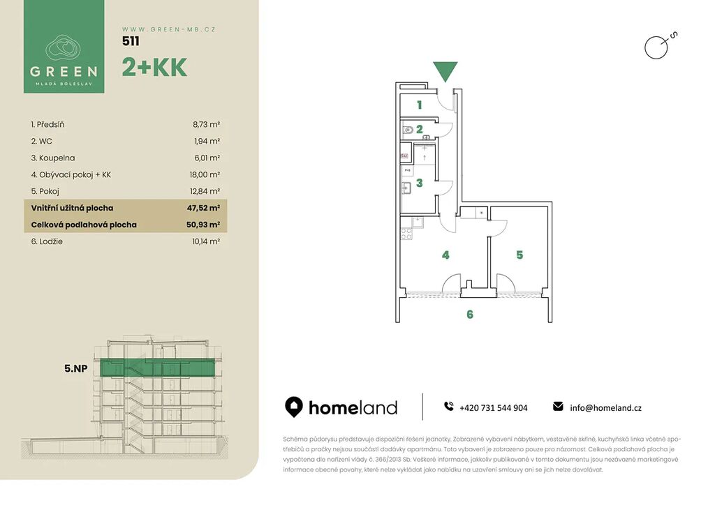 Světlý byt s prostornou lodžií o dispozici 2+kk a podlahové ploše 50,93 m² je součástí moderního rezidenčního projektu Green Mladá Boleslav. Projekt vzniká v atraktivní části Mladé Boleslavi, v těsné blízkosti golfového hřiště a zeleně, přesto však s výborným spojením do centra města. Dokončení a k nastěhování již jaro/léto 2026. Dispozičně je byt rozdělen na prostorný obývací pokoj s přípravou na kuchyňskou linku, samostatnou ložnici, předsíň, koupelnu, samostatné WC a praktickou komoru. Z obou pokojů je přímý vstup na j lodžii, která nabízí příjemný venkovní prostor k posezení či relaxaci.Díky vysokému standardu zpracování, podlahovému vytápění i chlazení a energetické třídě „A“ nabízí byt komfortní a zároveň úsporné bydlení. Objekt využívá moderní tepelná čerpadla, která přispívají k nízkým provozním nákladům.Součástí areálu je privátní komunitní zahrada vhodná k relaxaci či letnímu grilování, rozsáhlé parkovací možnosti včetně dobíjení elektromobilů a kompletní občanská vybavenost v pěší dostupnosti. Za příplatek garážové, nebo venkovní parkovací stání. Green Mladá Boleslav se nachází jen 5 minut jízdy od centra Mladé Boleslavi a zároveň poskytuje klidné prostředí obklopené přírodou. Projekt je situován v klidné části města s přímým napojením na zeleň a volnočasové aktivity. Bydlení v bezprostřední blízkosti golfových jamek osmnácti jamkového prestižního golfového hřiště přináší rezidentům široké možnosti pro trávení času s rodinou či přáteli. Pro více informací o jednotkách, cenách a dostupnosti kontaktujte naši kancelář, nebo navštivte oficiální webové stránky projektu GREEN-MB.