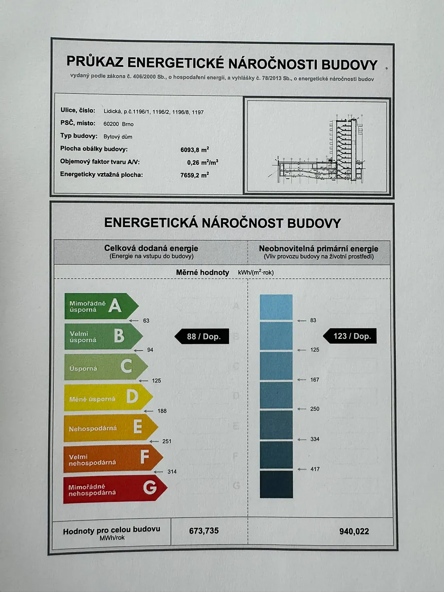 Budova má nízkou energetickou náročnost (B), v celé budově jsou izolační trojskla s velmi dobrou tepelnou i zvukovou izolací. V domě jsou použity mezibytové akustické příčky.