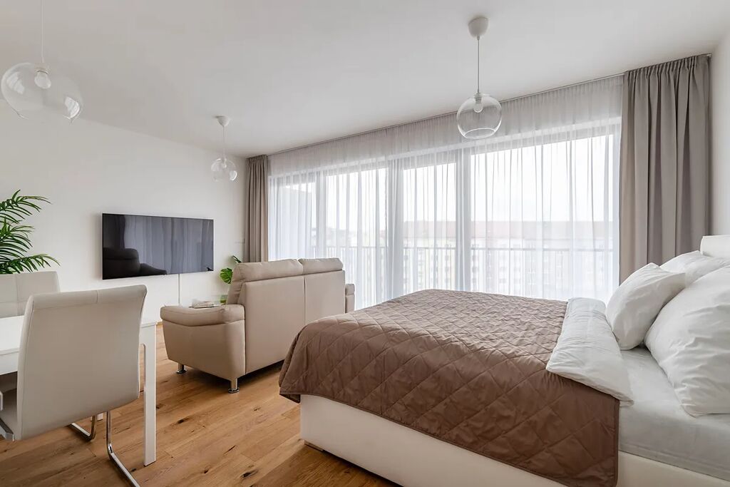 Nabízíme nájem nadstandardního bytu 1+kk s klimatizací a předokenními žaluziemi, o celkové ploše 42 m2, s balkónem 8 m2, zděnou sklepní kójí a parkovacím stáním, v novostavbě bytového domu přímo v centru Brna, orientovaný k západu do klidného vnitrobloku, v blízkosti nejvýznamnějšího brněnského městského parku Lužánky o rozloze 22,3 hektaru.