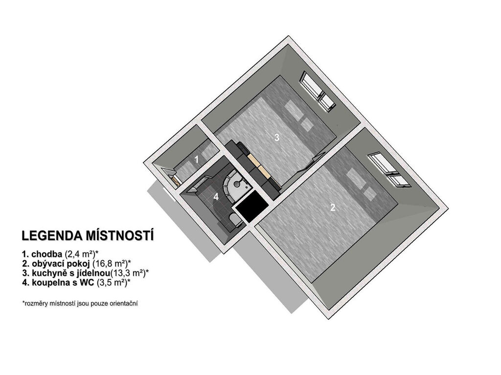 - Celková plocha: 39 m², včetně praktické sklepní kóje.