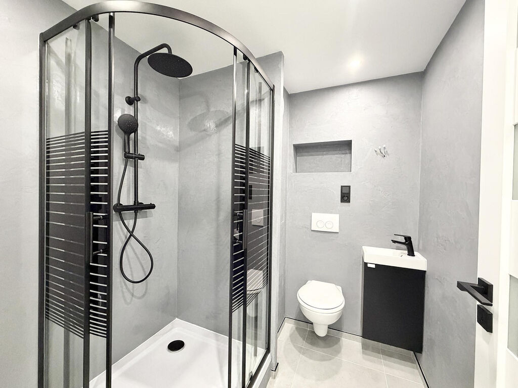 - Koupelna: Kompaktní koupelna je vybavena i přes malou plochu nadstandardně velkým sprchovým koutem s možností klasické i vrchní dešťové sprchy, což zvyšuje komfort užívání.