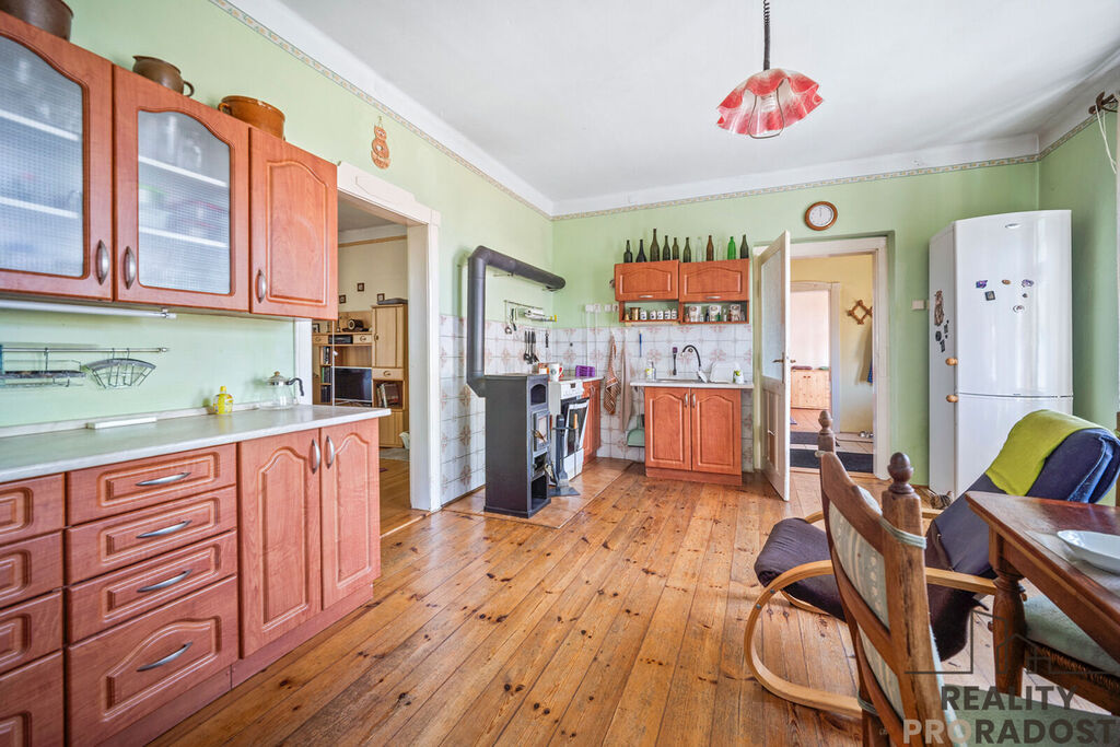 Vlevo se nachází kuchyně s jídelním koutem, která plynule navazuje na obývací pokoj.
