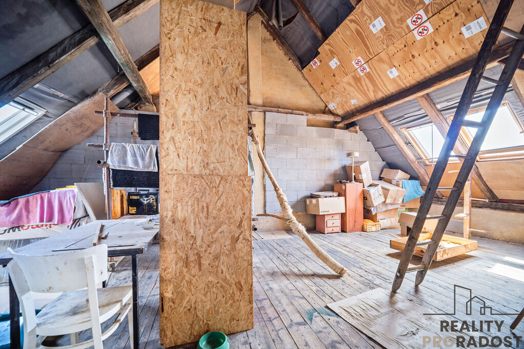 V patře se nachází další dva obytné pokoje. Druhá polovina půdy čeká na vytvoření dalších obytných místností.