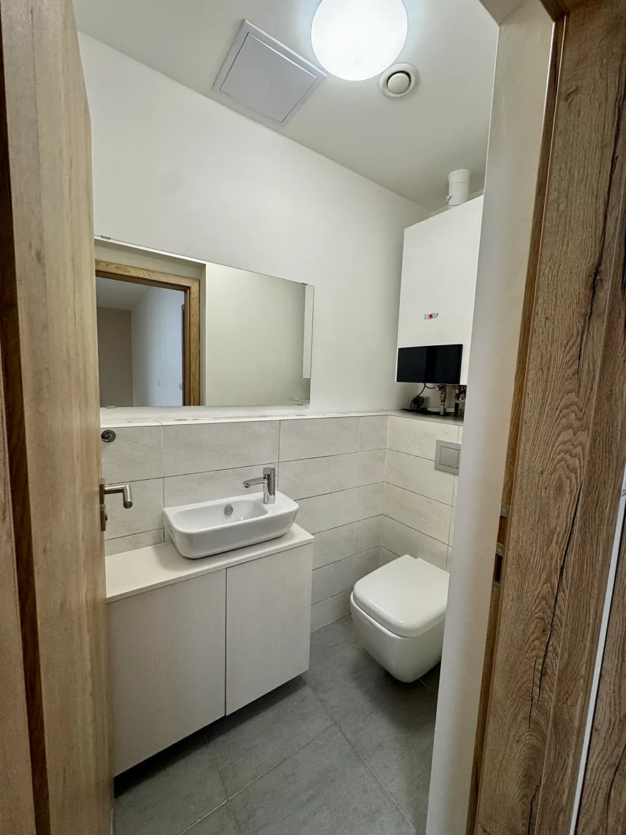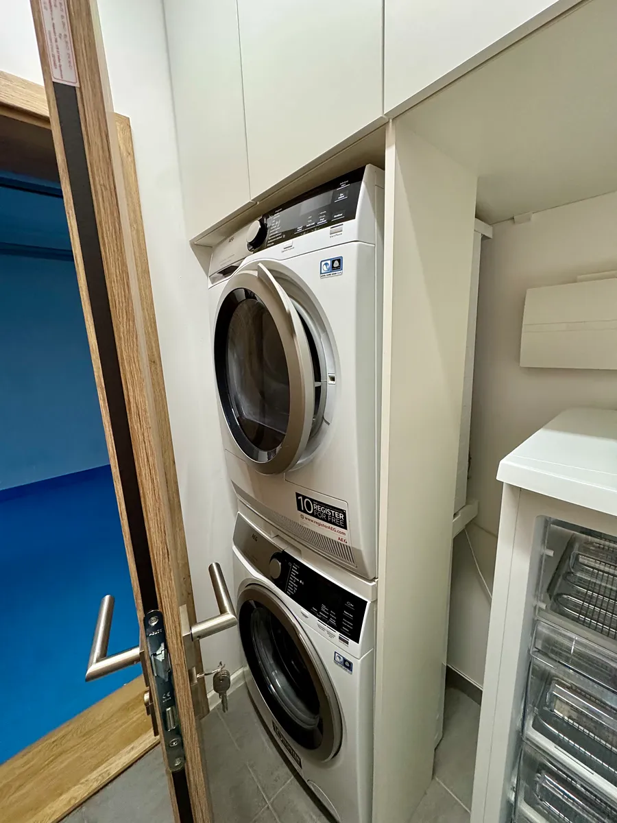 Technická místnost vybavená pračkou, sušičkou, mrazákem, botníkem