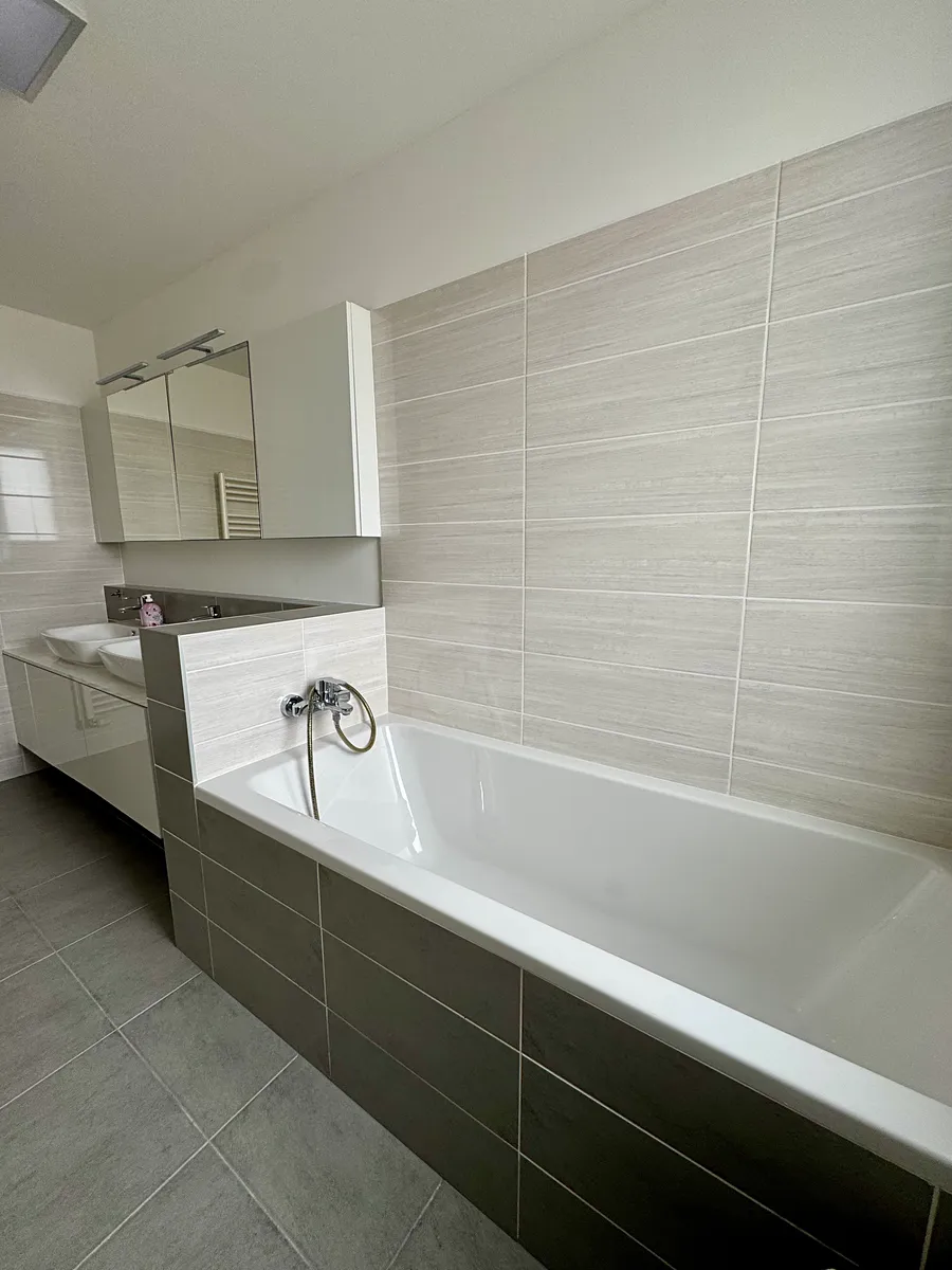 Koupelna s vanou, sprchovým koutem a dvěma umyvadly
