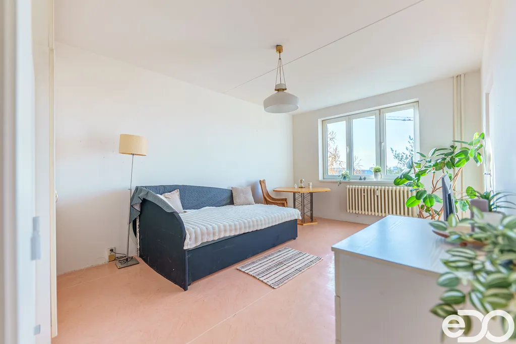 Obě obytné místnosti jsou neprůchozí, mají stejnou velikost a vlastní okno, díky čemuž je dispozice přirozeně vyvážená a nabízí dostatek soukromí. Okna jsou orientována na jihozápad, takže je byt po celý den příjemně prosvětlený.