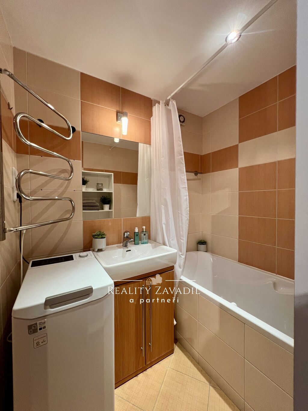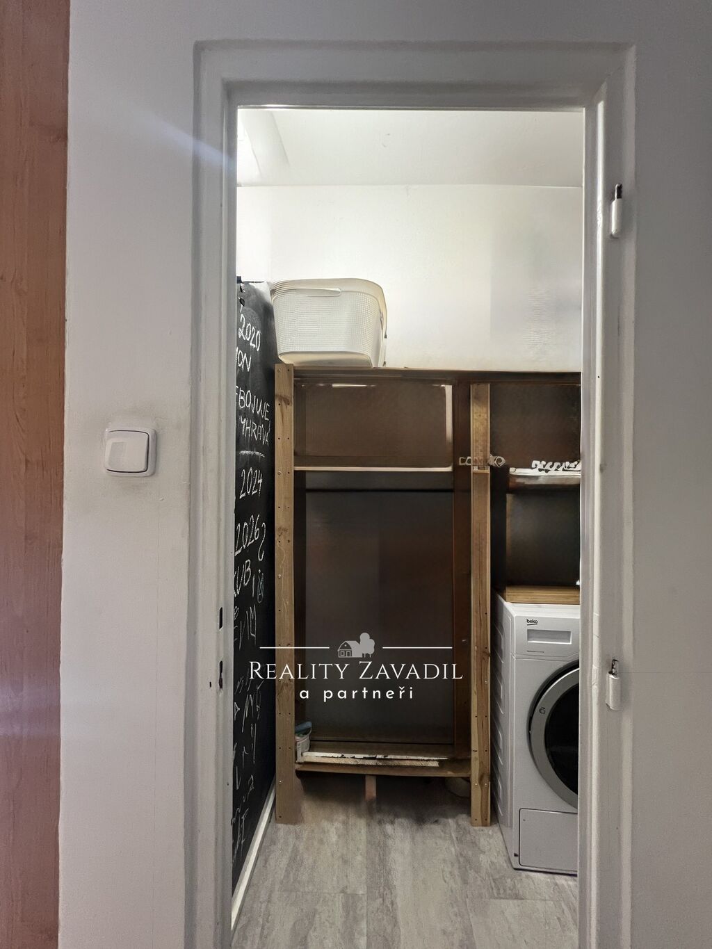 a koupelna s vanou, umyvadlem a pračkou. Z chodby vejdete do kuchyně, vybavenou vestavěnými kuchyňskými spotřebiči (horkovzdušná trouba, myčka na nádobí - BEKO) a samostatně stojící chladničkou s mrazákem.