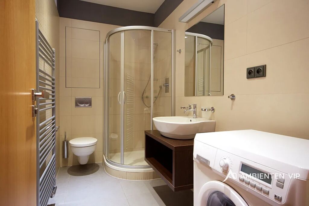 Koupelna disponuje sprchou, umyvadlem, WC a je zde také pračka.