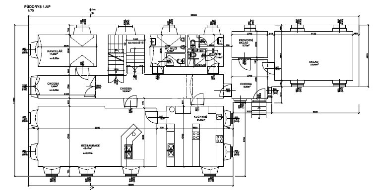 1.NP: restaurace s kuchyní a sociálním zařízením, sklad, 2x kancelář
