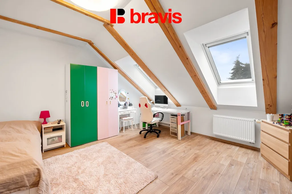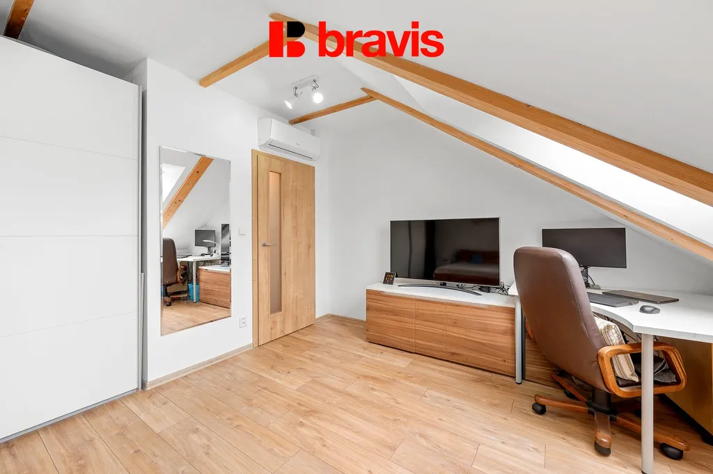 V horním patře bytu je pokoj o velikosti (20 m²), který může sloužit jako ložnice, pracovna či dětský pokoj.