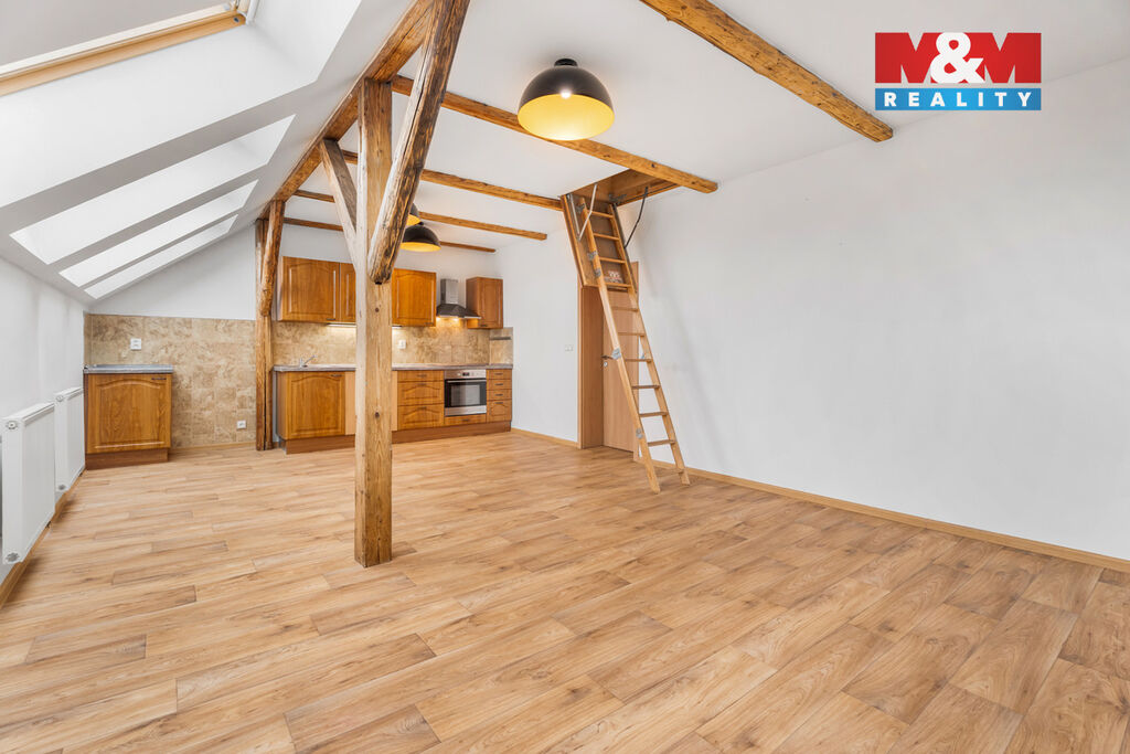 Byt o celkové ploše 90 m² (21 m² tvoří komora na půdě) prošel zdařilou rekonstrukcí. Nabízí prostorný obývací pokoj s kuchyňským koutem, ložnici či dětský pokoj, koupelnu s vanou, samostatnou toaletu a možnost rozšíření o další pokoj v mezonetu.