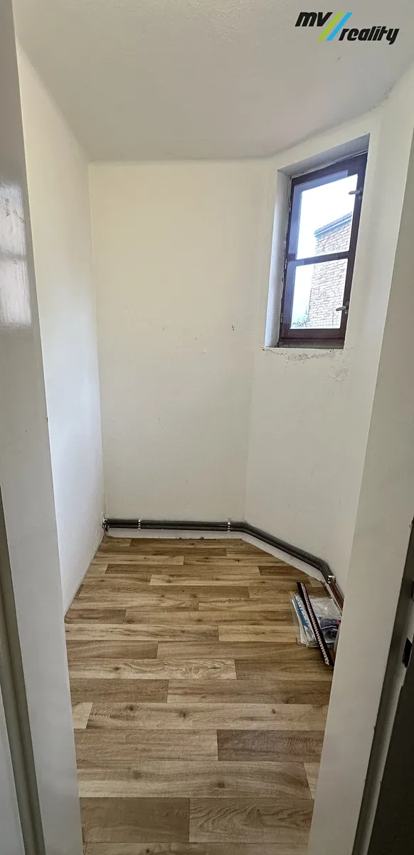 Dispozice bytu: Vstupní chodba, komora, kuchyňský kout s obývacím pokojem, pokoj, průchozí koupelna se sprchovým koutem a toaletou, druhá komora – ideální jako úložný prostor (šatna), ložnice.