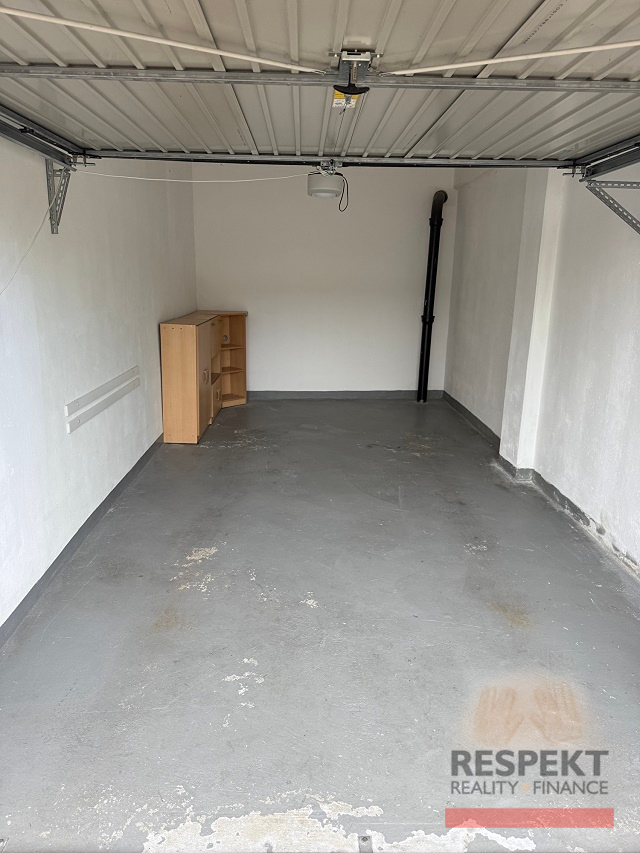Suchá, odvětrávaná, zděná garáž s kolaudací z roku 2000 má zavedenou elektřinu (230 V, osvětlení, 2 zásuvky) a nově vyklápěcí vrata na dálkové ovládání. Výška vjezdu při otevřených vratech 1,87 m, šířka 2,2 m, výška podlaha- strop 2,57 m. Obvodová zeď je ve vlastnictví SVJ - její údržba je hrazena z fondu oprav.