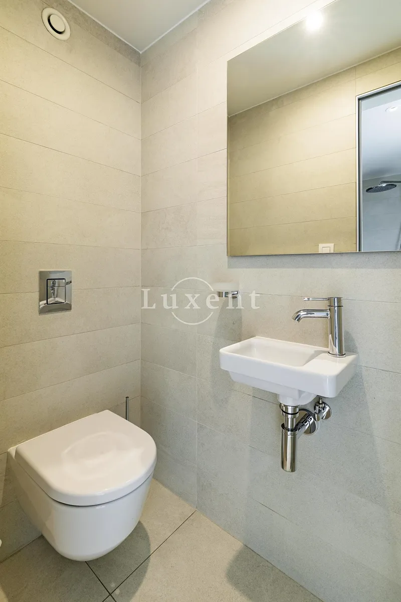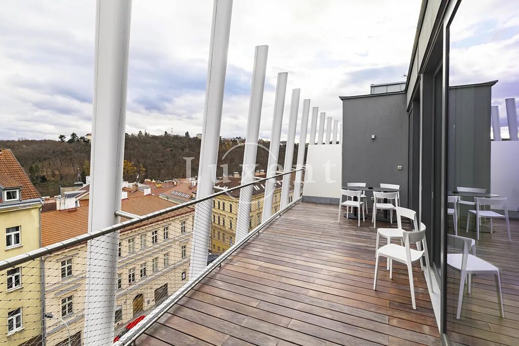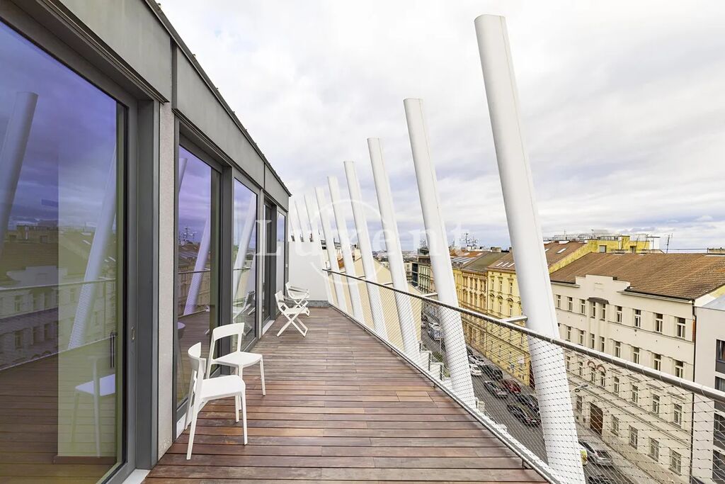Nabízíme k pronájmu prostorný mezonetový penthouse 4+kk o užitné ploše 212 m² se třemi terasami v 6. a 7. patře novostavby rezidenčního projektu s výtahem a množstvím nadstandardních doplňkových služeb jako je recepce, bazén, wellness a rozlehlá společná zahrada v uzavřeném vnitrobloku. K bytu náleží sklep a za příplatek lze pronajmout parkovací stání v podzemních garážích.