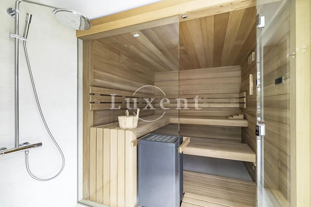 V patře mezonetu se nachází privátní sauna se samostatným sprchovým koutem a toaletou, terasa s panoramatickým výhledem do okolí a zahrada.