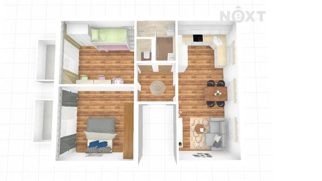 Byt se nachází ve 2. NP a nabízí dva prostorné balkony – ideální pro ranní kávu i večerní odpočinek.