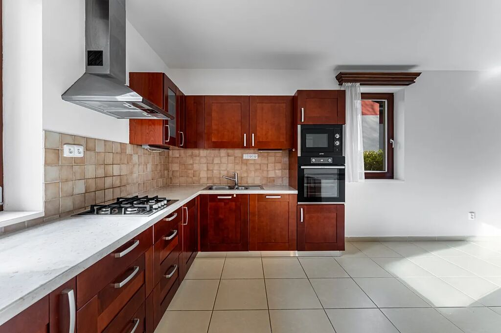 Kuchyně je vybavena spotřebiči včetně elektrické varné desky, lednice, mrazáku, mikrovlnné trouby, elektrické trouby, digestoře a myčky na nádobí. Dům je vybaven zabezpečovacím alarmem a připojením na internet, které není v ceně nájmu.