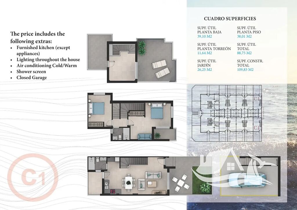 Tento moderní řadový dům o dispozici 4+kk je navržený pro ty, kdo hledají pohodlné zázemí a zároveň si chtějí dopřát blízkost pláže a živého pobřežního života. Na ploše 109 m² najdete světlý obývací prostor s kuchyňským koutem, tři ložnice, dvě koupelny a terasu o velikosti 30 m², která přímo vybízí ke snídani venku nebo večernímu posezení při západu slunce.