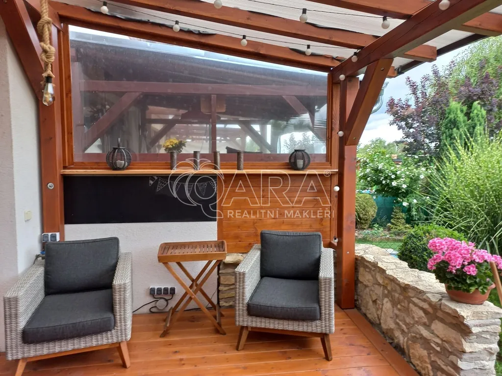 Přes zádveří se vstupuje do obývacího pokoje s výhledem do zahrady. Tento prostor je neskutečným bonusem celého domu, zahrada poskytuje Vašemu životu velký komfort. Pokračováním obývacího pokoje a neoficiální čtvrtou místností domu je vyhřívaná terasa, kde můžete trávit spoustu krásných večerů i v chladnějších měsících. Výhodou celého pozemku je i jeho propojení s okolím. Ze zahrady máte totiž přístup zadní brankou ven přímo do parku s nedalekým dětským hřištěm.