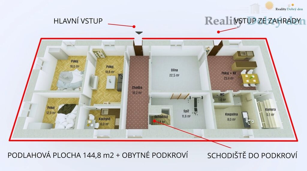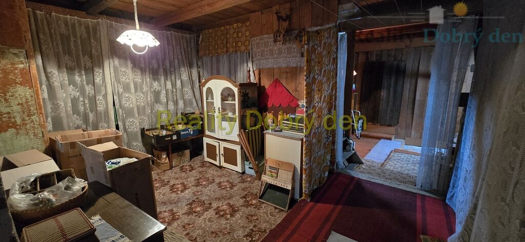 Budova je citlivě rozdělena na dvě propojené části, na část obytnou a část užitkovou. V obytné části se nalézají 3 pokoje, kuchyně, veliká spíž, z chodby pak vstup do obytného podkroví. Z fotodokumentace podkroví je patrné, že obytné prostory podkroví se mohou ještě značně rozšířit, což zejména v případě komerčního využití chalupy nabízí veliký potenciál. V užitkové části budovy se pak nalézá černá kuchyně, koupelna se sprchovým koutem, WC, skladové a dílenské prostory, výstup na terasu před domem. Vše patrno z videa a fotodokumentace. Ohřev vody zajišťuje elektrický boiler, vytápěn je tuhými palivy. Díky dotačním titulům lze úpravy domu včetně způsobu vytápění snadno změnit.
