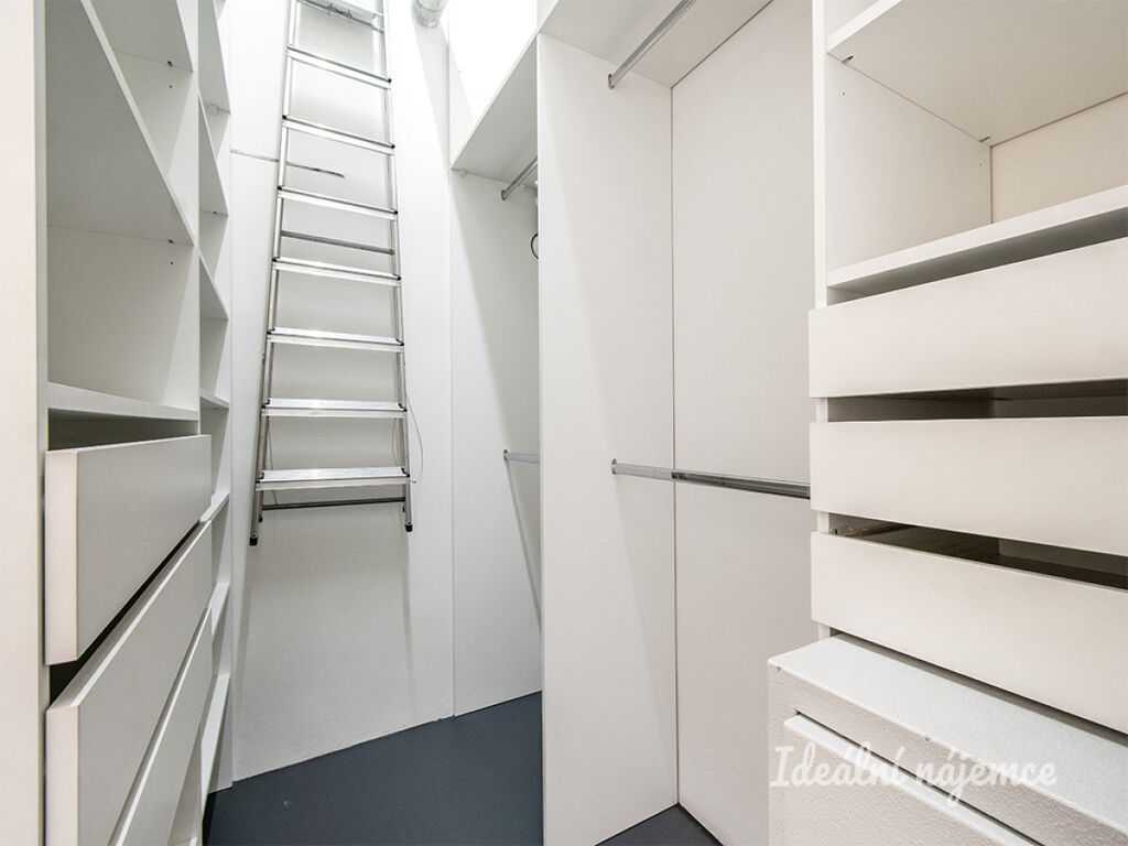 ‍Celková rekonstrukce bytu proběhla v roce 2017. Jeho dominantou je obývací pokoj s velkoformátovými okny a elegantní galerií. Celý prostor je maximálně prosvětlený a působí vzdušně – ideální místo pro ty, kdo chtějí bydlet originálně a stylově. Součástí hlavní místnosti je vestavěná knihovna.